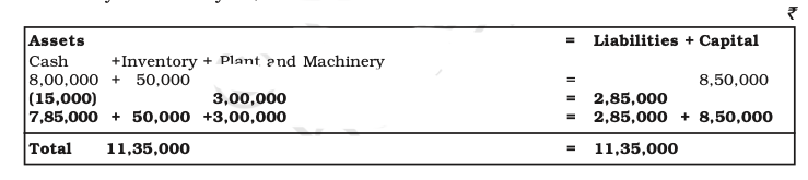 - There is an increase in plant and machinery by ₹3, 00,000, and a decrease in cash by ₹ 15,000.